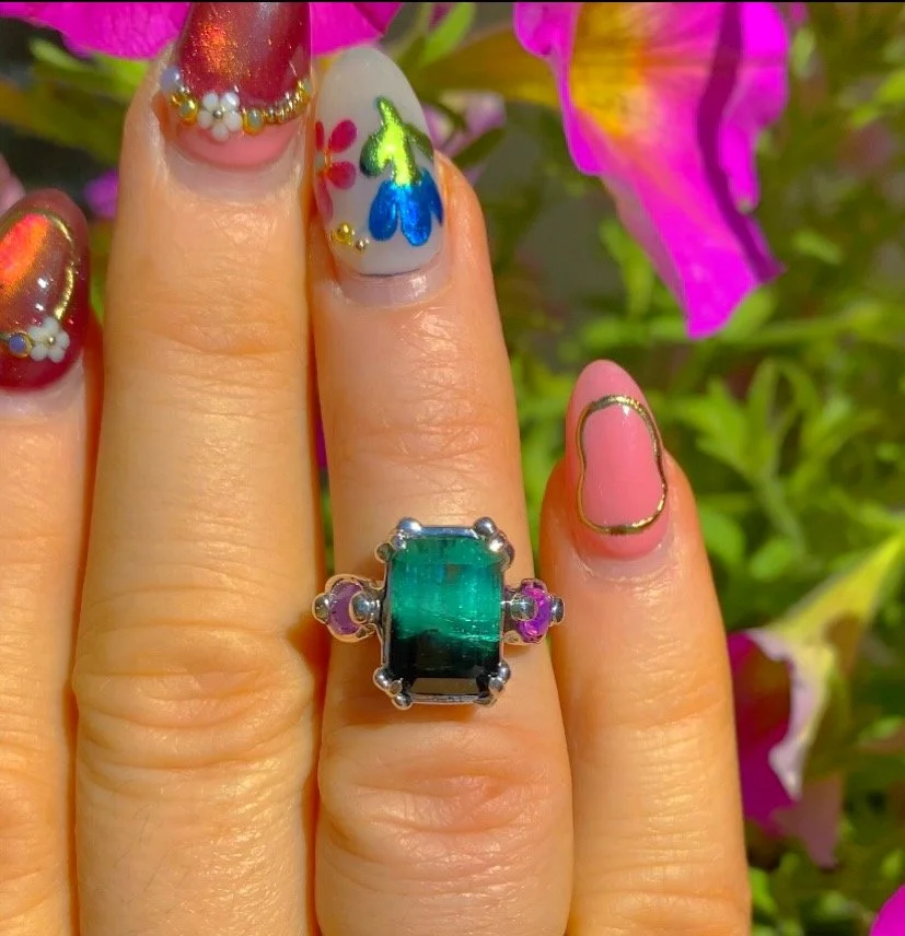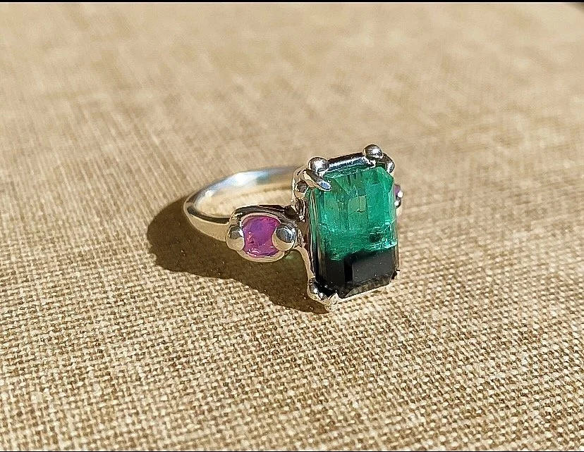 Here we have a stunning large 6.30ct Teal/Black Bi coloured Tourmaline Ring with two pink opalescent Sapphires on the shoulders.